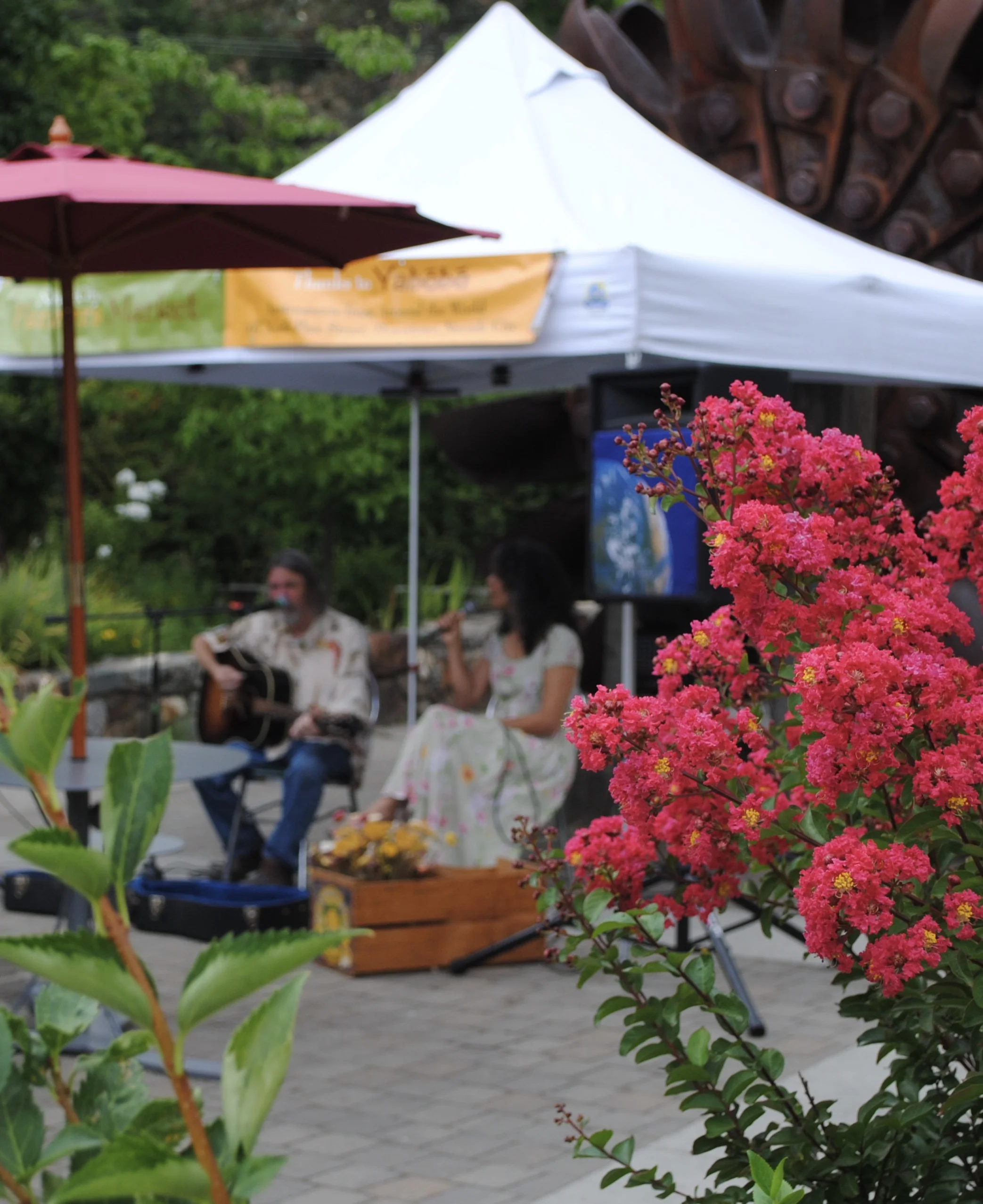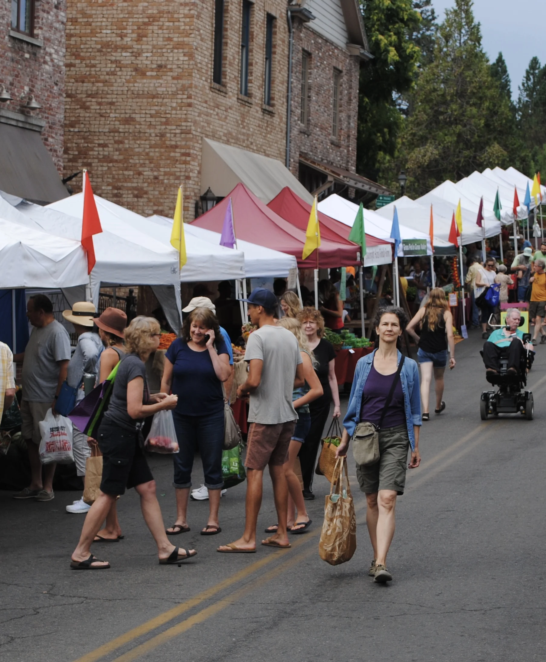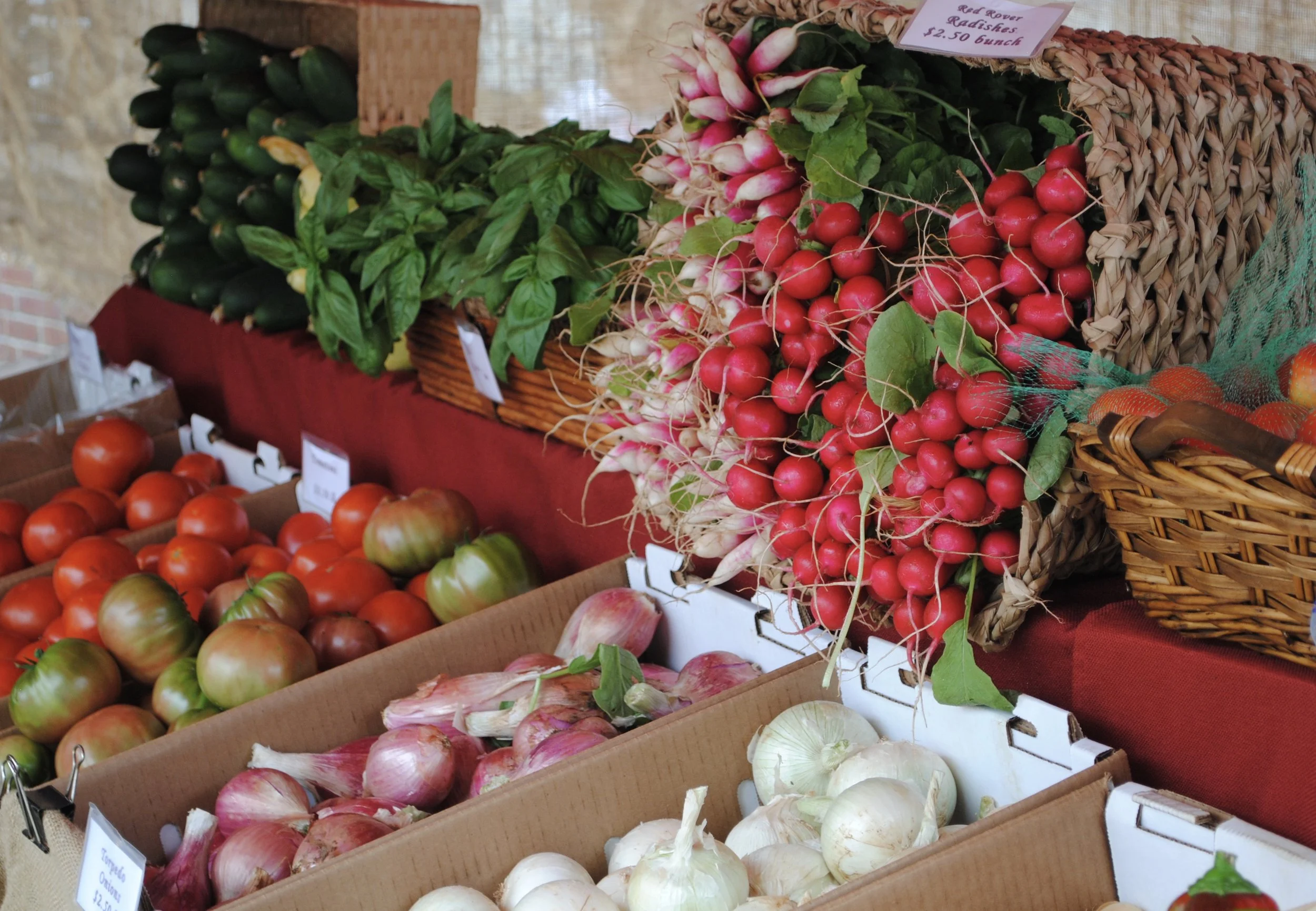About four blocks walk from my apartment, every Saturday morning, the Nevada County Growers have an open market from 8:30 to 1pm. This morning was overcast and cooler, which made the amazing produce look even fresher than it was, if that is possible. Truly beautiful!! I filled my basket with vine-ripened tomatoes, a fragrant 'Ambrosia' melon, arugula, rainbow chard, and fresh-baked bread. I filled my camera with the eye-popping colors of organically grown fruits and vegetables, flowers and herbs. Fresh-caught, never-frozen fish was also on offer, also sustainably-raised meats and charcuterie, along with local honey and many artisan crafts.
